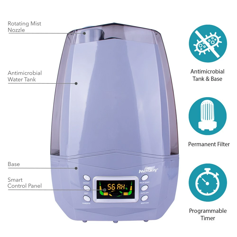 Packed with convenience features, this ultrasonic humidifier from Air Innovations makes it easier than ever before to add soothing cool mist moisture to bedrooms, living rooms, and other spaces up to 400 square feet.