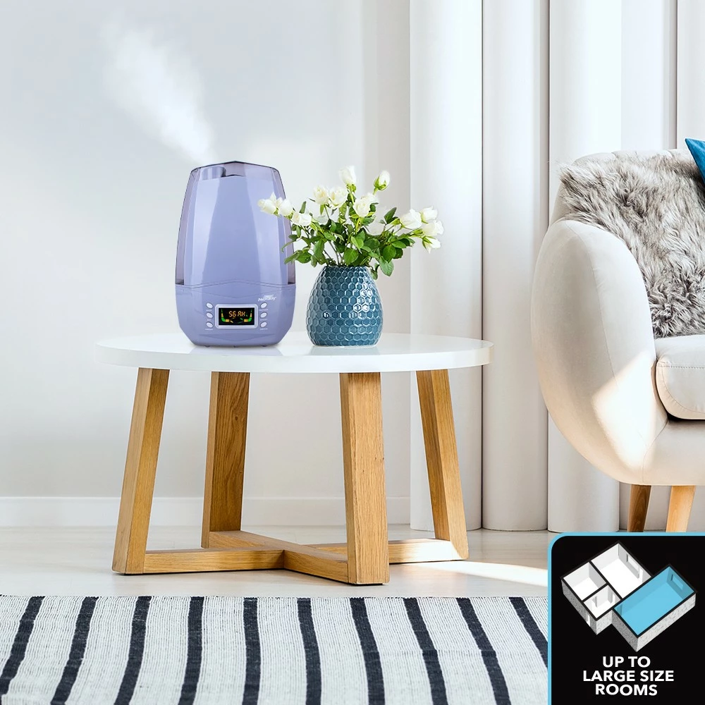 For the ultimate in user-friendly humidification, turn to the Air Innovations 1.5 Gal. Ultrasonic Cool Mist Humidifier. Featuring an extended run-time of up to 80 hours, you’ll get more humidification between refills. Easy-to-operate, it features touch controls and a programmable humidistat for set-it-and-forget-it operation. This tabletop humidifier is available in multiple color options, allowing you to choose the one that best fits your space up to 400 square feet.