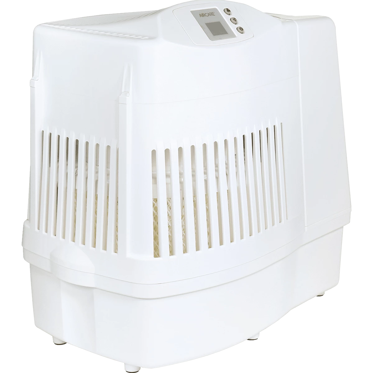 Add soothing therapeutic moisture to your entire home with a single console humidifier, the AIRCARE MA0800 MoistAIR Whole-House Mini-Console Evaporative Humidifier (formerly known as the Essick Air MA0800.) This evaporative cool mist humidifier disperses up to 8 gallons of cool mist moisture per day and is rated to humidify homes up to 2,600 square feet. With simple digital controls, an onboard humidistat, and set-it-and-forget-it operation, it helps take the stress out of maintaining optimal humidity.