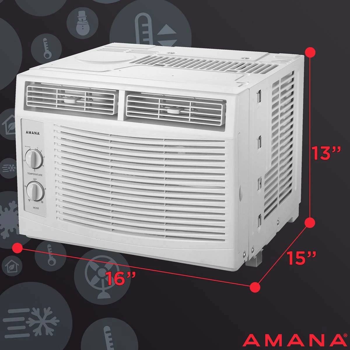 Affordable and easy to install, the Amana AMAP050BW window mounted air conditioner quickly cools a room up to 150 square feet. Features such as mechanical rotary controls give you the option of 2 speeds to gauge the amount of cooling you want. 8Â-way air directional air louvers give you the freedom to send the cold air exactly where you need it.