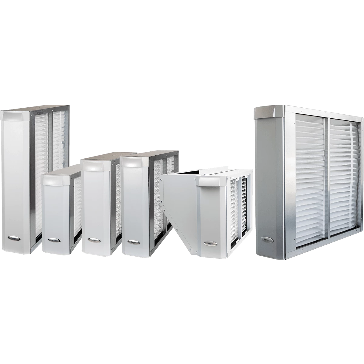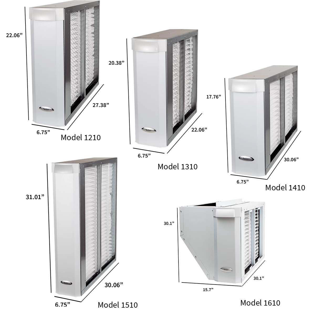 There are 5 models available in multiple duct sizes. Aprilaire models 1210, 1310, and 1410 are designed to be used with traditionally configured HVAC systems. Models 1510 and 1610 are tailored for larger low static pressure and upflow HVAC systems, respectively. Please use the comparison chart below to help you select the right model for your system. All models will purify your entire home when operating at the recommended airflow rate of 2,000 cubic feet per minute (CFM). MERV-11 filtration is capable of removing 85% of pollen-sized particles (5 microns), 80% of mold spore-sized particles (3 microns), and 50% of all dust particles measuring 1 to 3 microns. MERV-13 filtration is available as an upgrade.Â