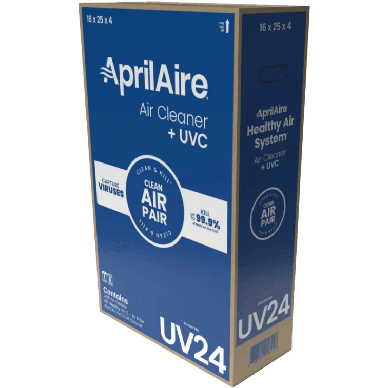 Improve indoor air quality with the AprilAire Clean Air Pair, a powerful bundle featuring an air purifier, a MERV-13 filter, and a UVC coil cleaner, effectively capturing airborne particles and eliminating 99.9% of mold on your A/C coil.