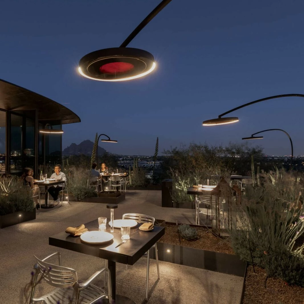 Leveraging outdoor spaces for a variety of uses, including dining, working, and gathering, create safe and healthy environments at home and in industry. This Bromic portable radiant heater with LED light rail is highly efficient, heating people rather than the air, and is constructed to last for years, without the need for replacement.