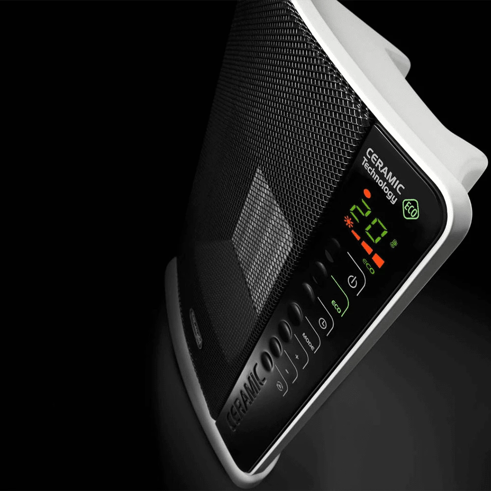 The newly-designed DeLonghi DCH7093ER is an affordable, 13-inch high flat panel ceramic heater that can be placed just about anywhere. A digital display and soft-touch buttons make it simple to set your ideal temperature and choose one of 3 heat levels for quick whole-room heating with 5,118 BTUs of heat.