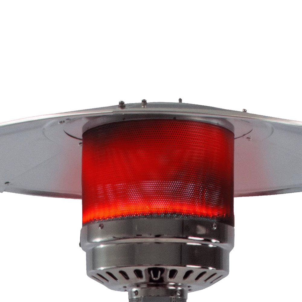 This outdoor patio heater is made of durable stainless steel with an easy-to-access LP gas storage space. The wide reflector plate is designed to increase and disperse heat up to 20-feet surrounding the heater.