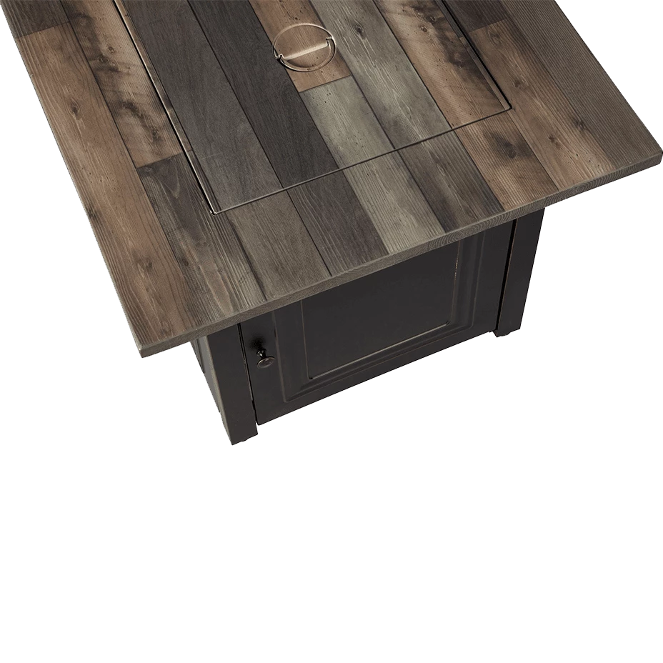 - Attractive and Rustic Design: Faux wood top with clean lines adds a rustic charm to any outdoor space. This fire dances above bronze fire glass to create an ideal ambiance in your space.