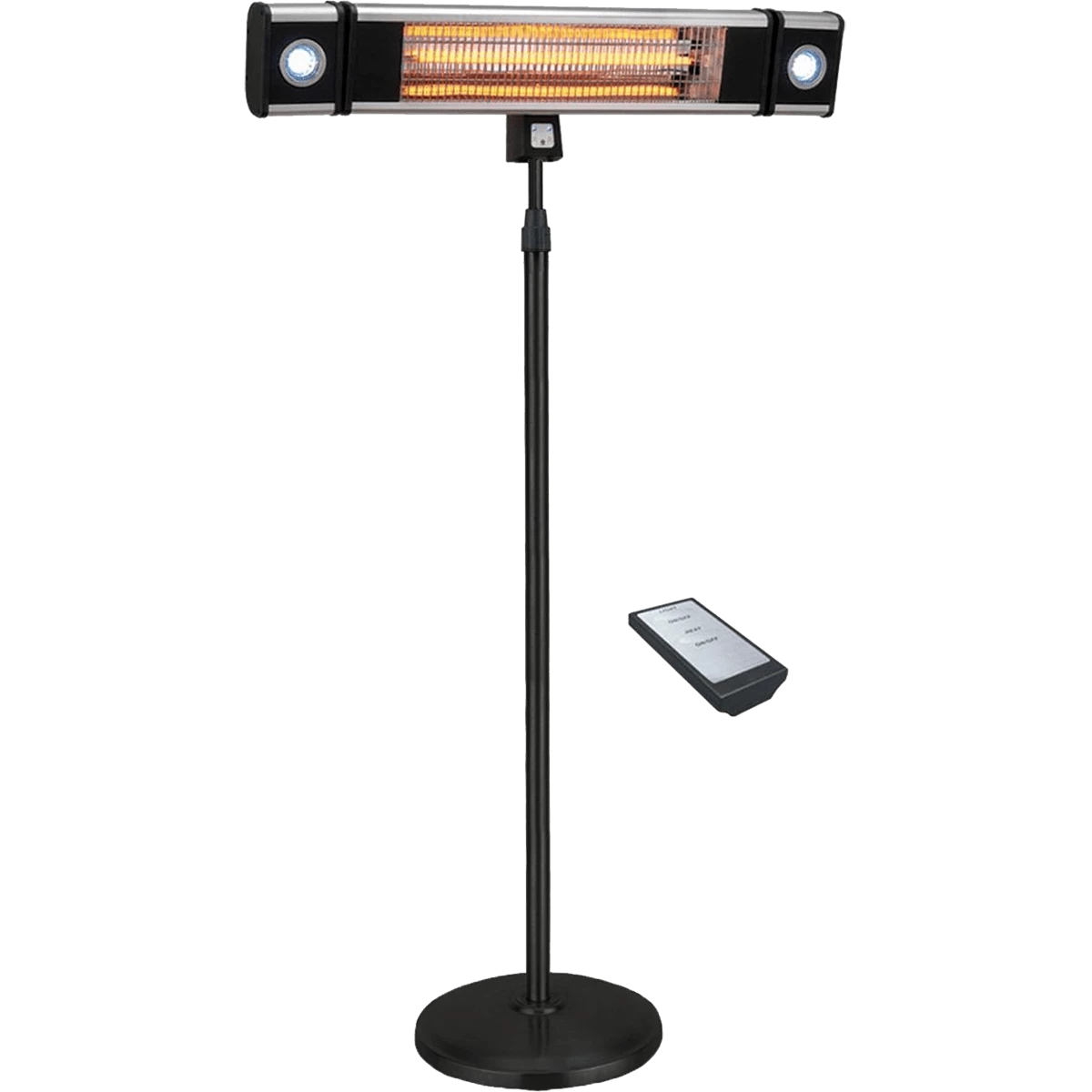 Plugs into a standard 120-volt electrical outlet, and radiates heat up to 12 feet and is rated for outdoor use. Includes two LED lights on each side which can be used optionally for extra light when needed. Use the handy remote control for fast adjustments.