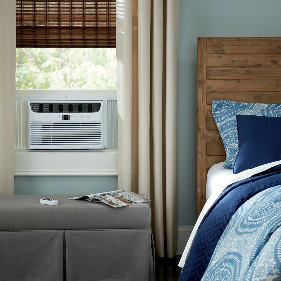 Quickly and efficiently cool areas up to 350 square feet with the Frigidaire 8,000 BTU Window-Mounted Room Air Conditioner. It’s one of the easiest window ACs to operate thanks to a programmable thermostat, digital controls, and remote control with a remote temperature-sensing feature. In addition, this model earned a 12.0 Energy Efficiency Ratio (EER) and an Energy Star seal.