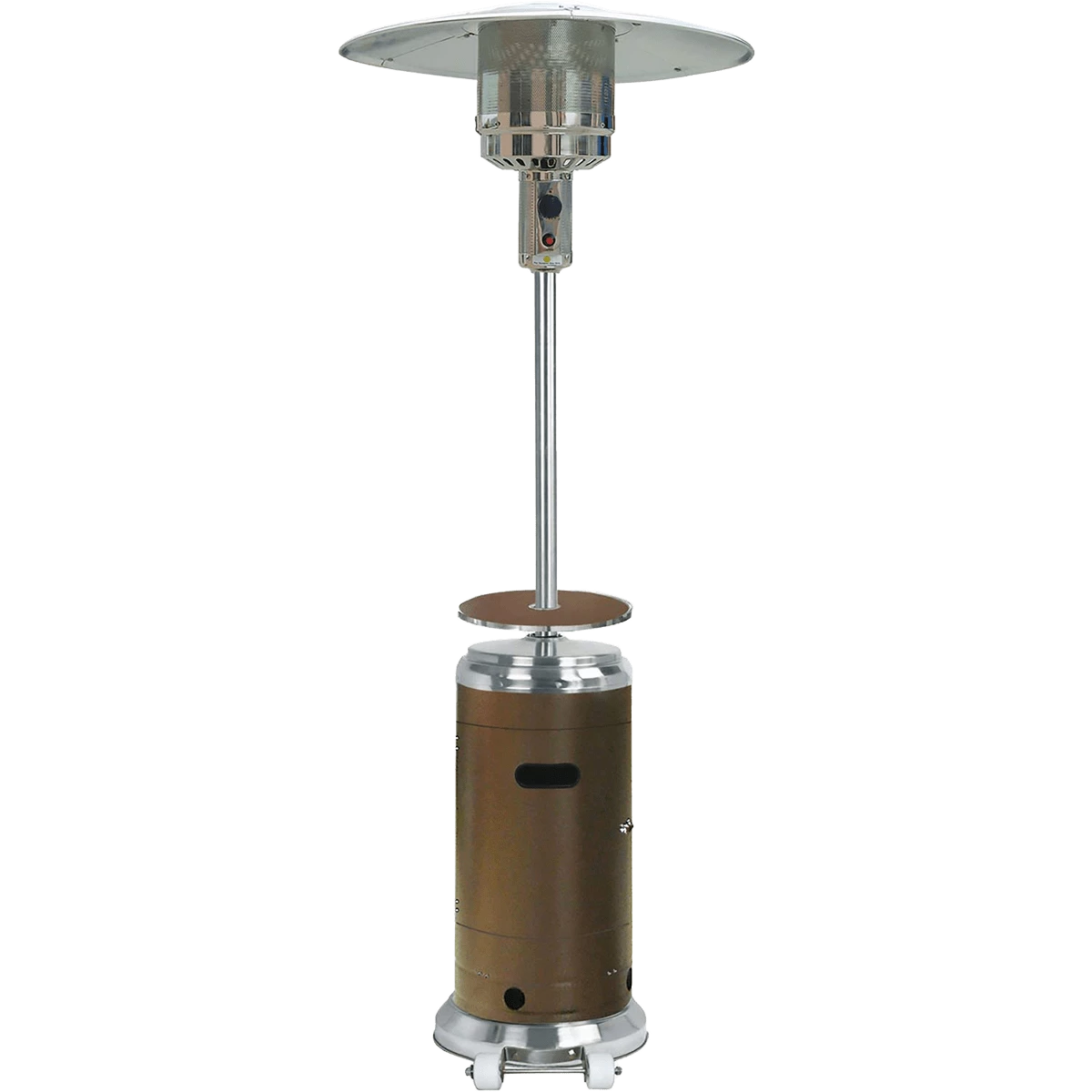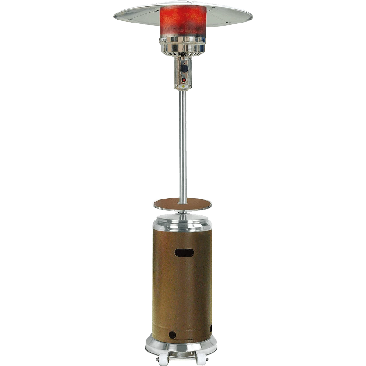 Crafted for elegance and refinement, the 7-foot tall Hanover HAN002BRSS features a powder-coated bronze base that hides the 20-pound propane tank. Stainless steel accents are buffed and polished for a high shine, and the steel umbrella top protects the heating emitter screen.