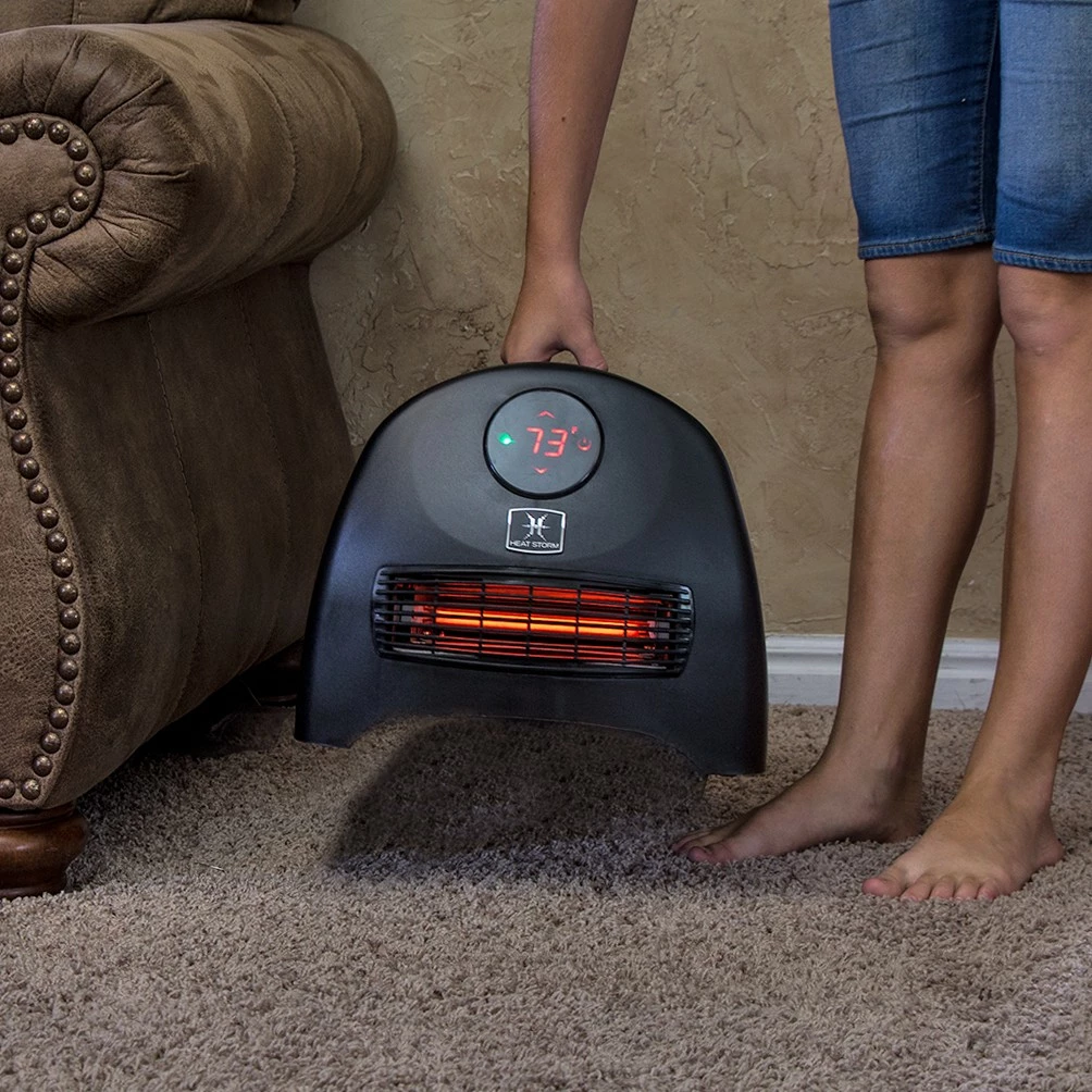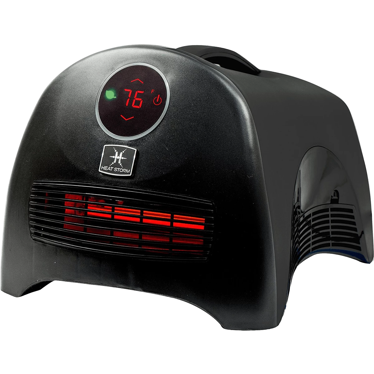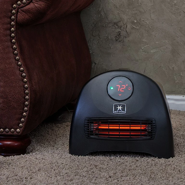 Equipped with an internal thermostat that keeps your room temperature accurate, the affordable Heat Storm Sahara uses efficient quartz infrared heating to warm large spaces. An easy carrying handle and only 12 pound-design makes this one of the most portable heaters around.