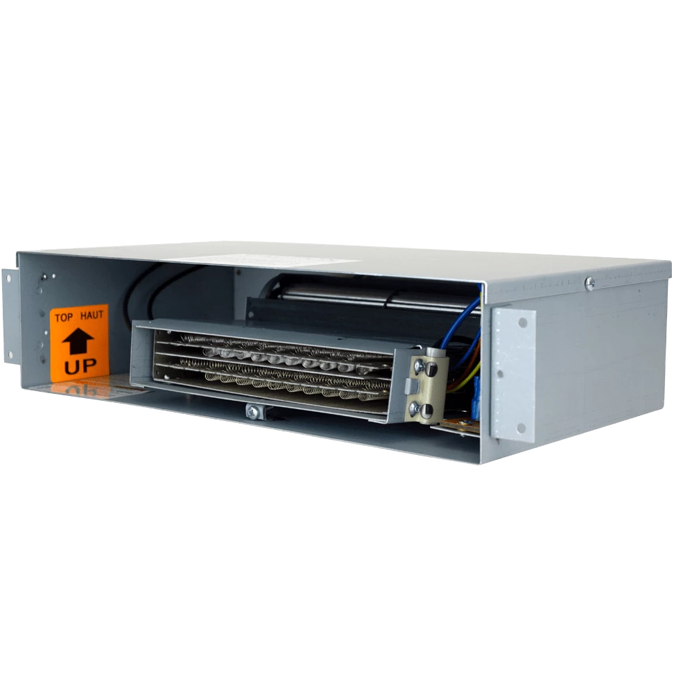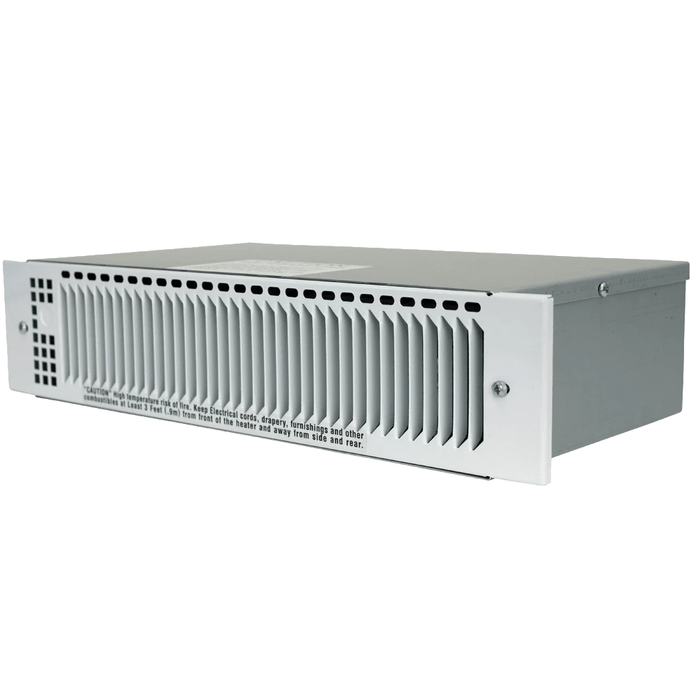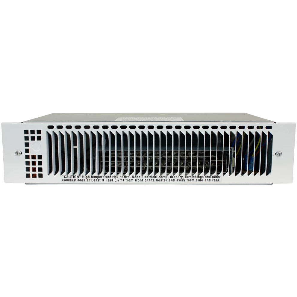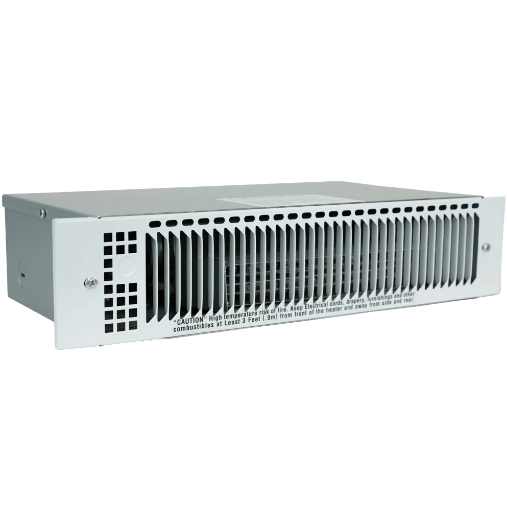 Offering a 3.5-inch high design, this low profile heater fits easily under cabinets and can be installed into the wall or on the floor level. Suffuse heating across cold tile or vinyl in your bathroom or kitchen without sacrificing floor space or where baseboard heaters won’t fit. Designed with 4 rows of Nichrome wiring and mica insulator, the quiet motor pushes fan-driven 70 CFM of warm air around your space.