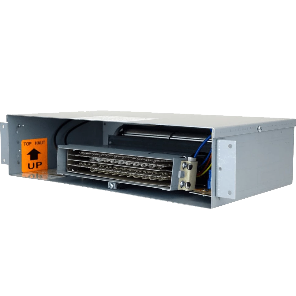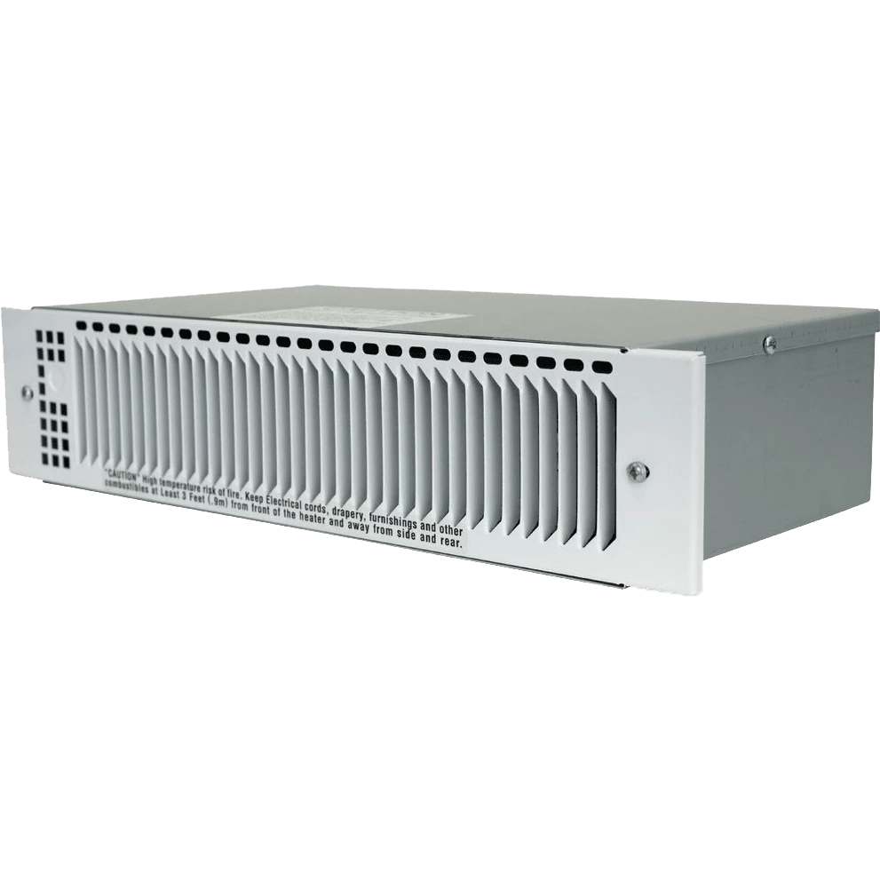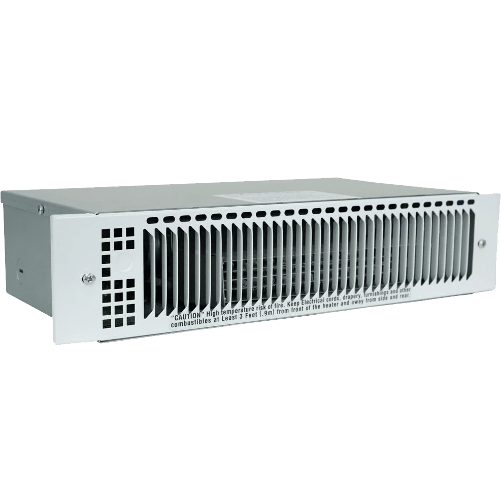 Offering a 3.5-inch high design, this low profile heater fits easily under cabinets and can be installed into the wall or on the floor level. Suffuse heating across cold tile or vinyl in your bathroom or kitchen without sacrificing floor space or where baseboard heaters won’t fit. Designed with 4 rows of Nichrome wiring and mica insulator, the quiet motor pushes fan-driven 70 CFM of warm air around your space.