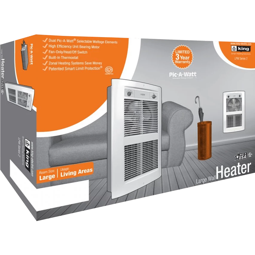 Keep warm in your home or office with the King Electric LPW ComfortCraft Pic-A-Watt Heater. This large wall heater combines a sleek, curved exterior grille design with a built-in thermostat. Great for spaces between 200 – 550 square feet, this large heater features a 5-year warranty.
