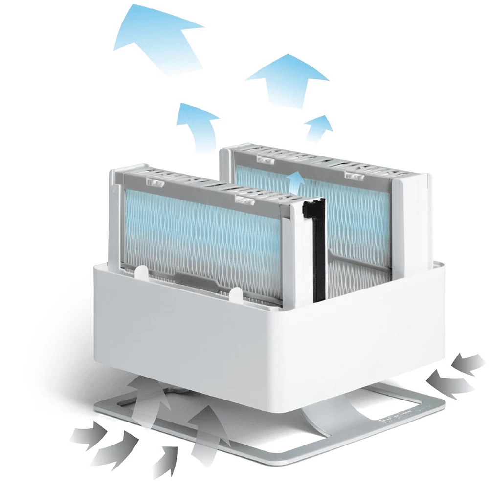 - Mineral-Absorbing Filters – Dual onboard wick filters serve two purposes. First, they help “wick” up water for evaporation into your air. These filters also help absorb excess mineral content in the water to guard your environment against harmful white dust.