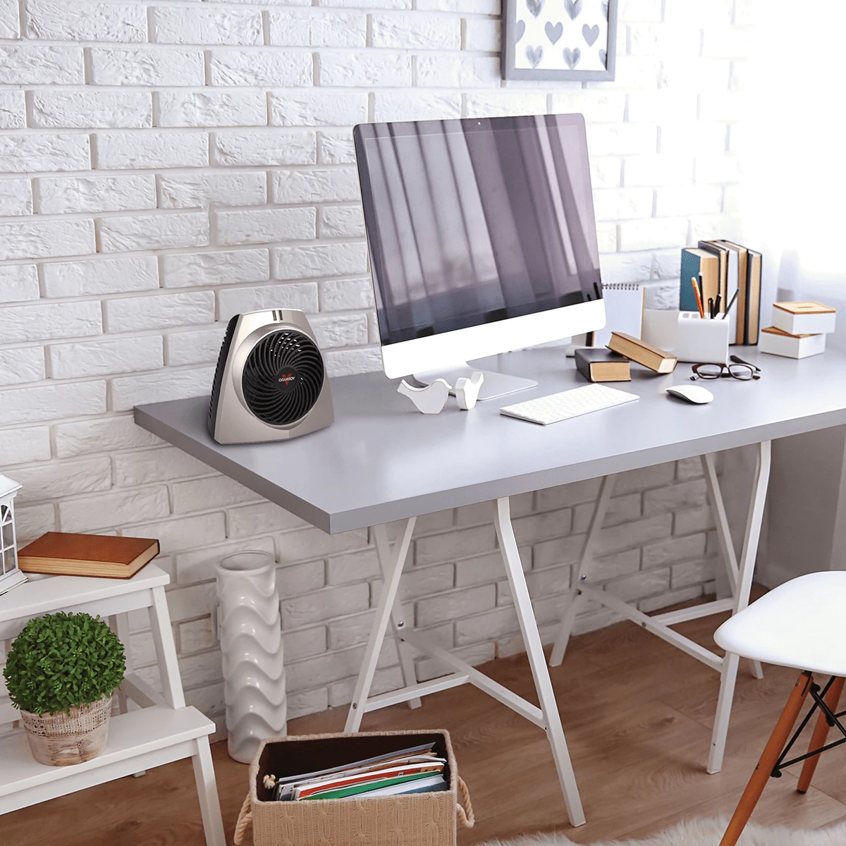 Create a warm, comforting space with the 7.05-inch high Vornado Personal Space Heater with Vortex Technology (VH203). Compact and lightweight, this Vornado heater is great at creating personal warmth, as it uses 2,559 BTUs of heating and Vortex Heat Circulation for tabletop and under-desk applications. Pitched fan blades circulate heat between 37.5 – 75 square feet, while 2 fan speeds offer a variable heat supply. Other features include tip-over and overheat protection, compact design, and more.
