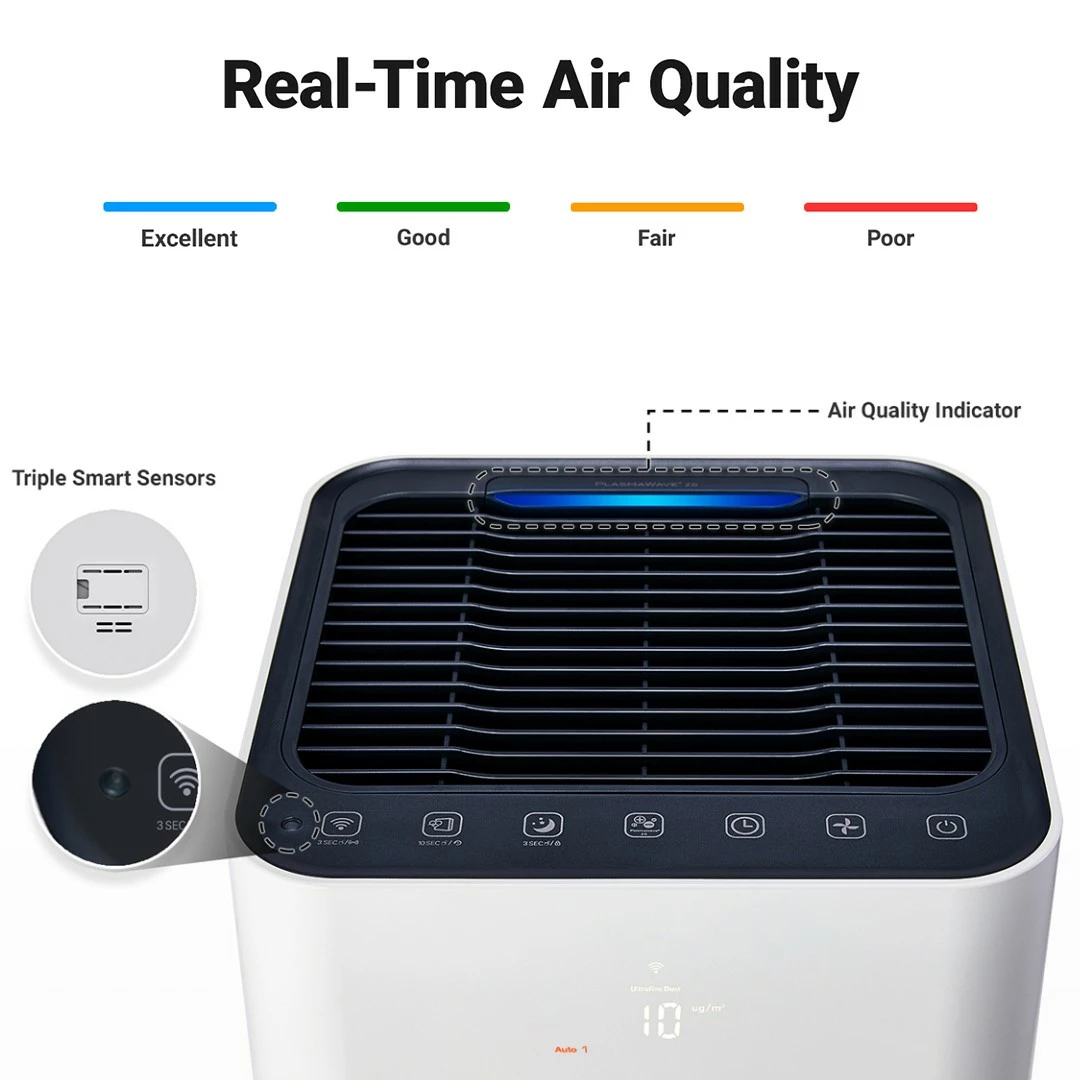 - Real Time Air Quality Updates:Â Triple smart air quality sensors measure how many particles are present in your air. The cleaning speed automatically adjusts based on these readings to provide the most accurate and efficient air purification. A color-coded air quality indicator changes in real time based on your current air quality (blue, green, yellow or red).Â